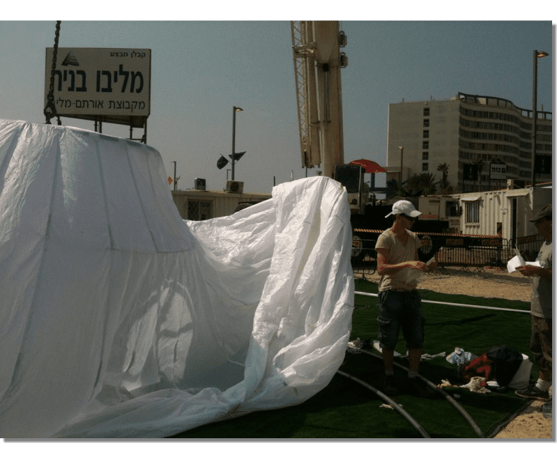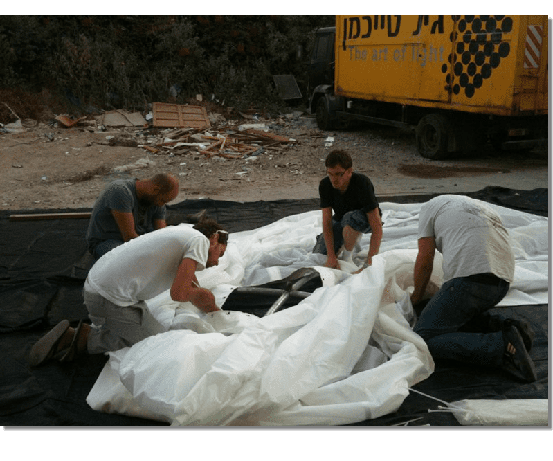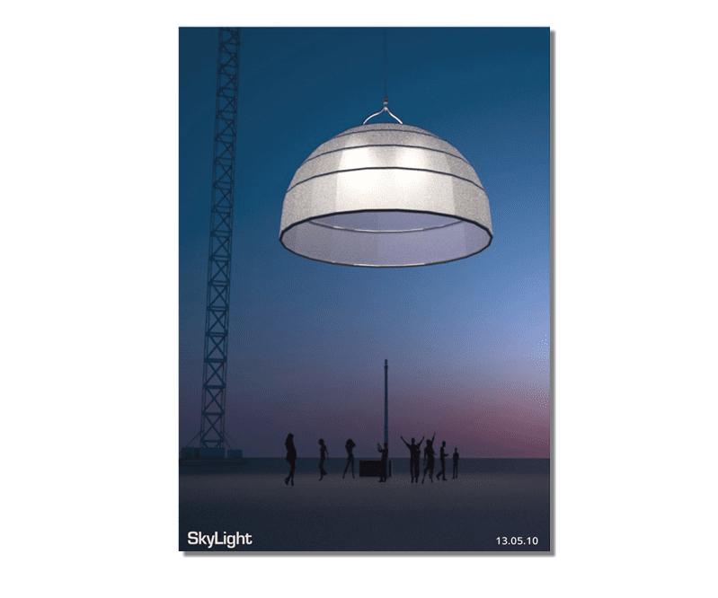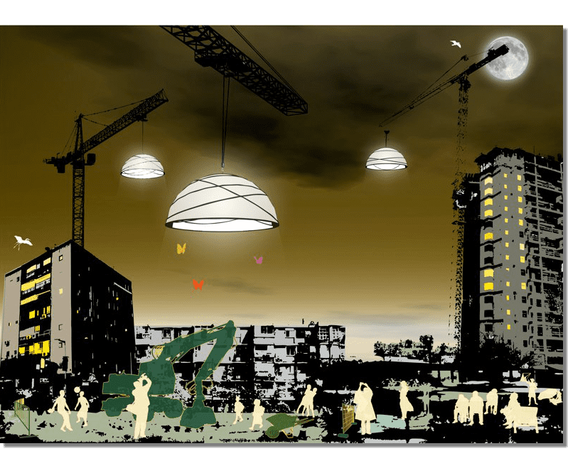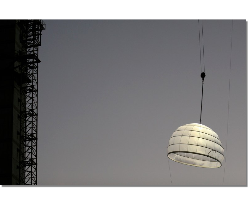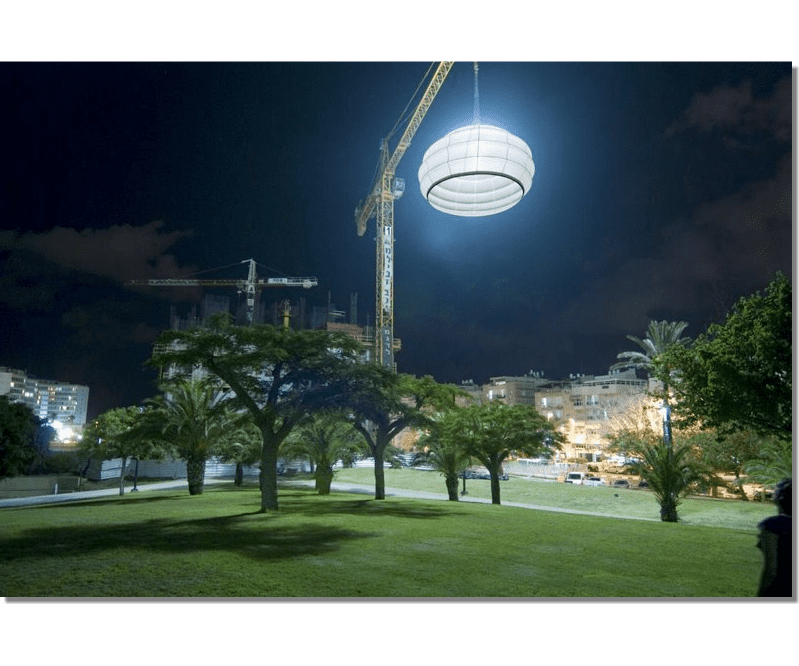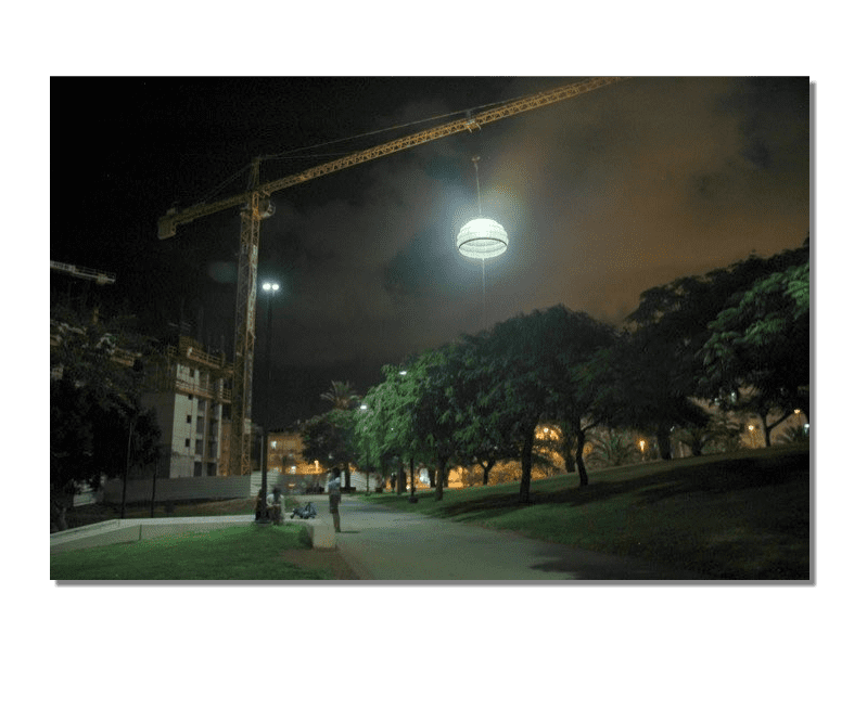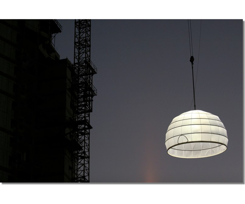 A project Created for 2010 Bat-Yam International Biennale of Landscape Urbanism. The concept is to illuminate the construction sites which are 'black holes' in the urban landscape. We hang Ikea 10m diameter Ikea Crinoline style paper light shades using the cranes which are idle during the night time. The Crinolines themselves are created using sailing canvas cut & stitched electronically to fit fiberglass reinforcement.