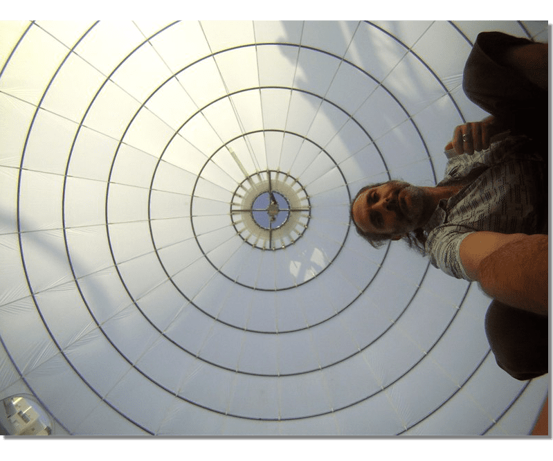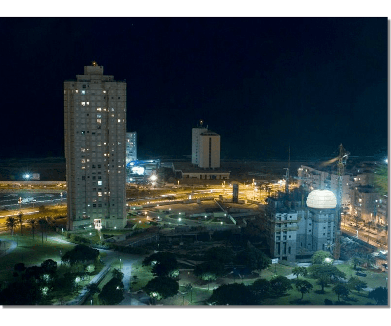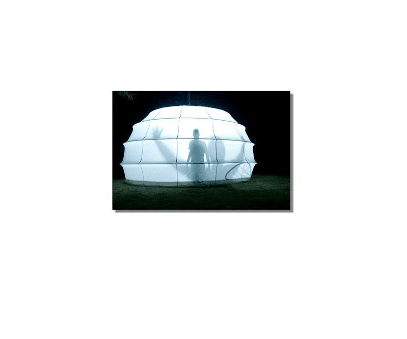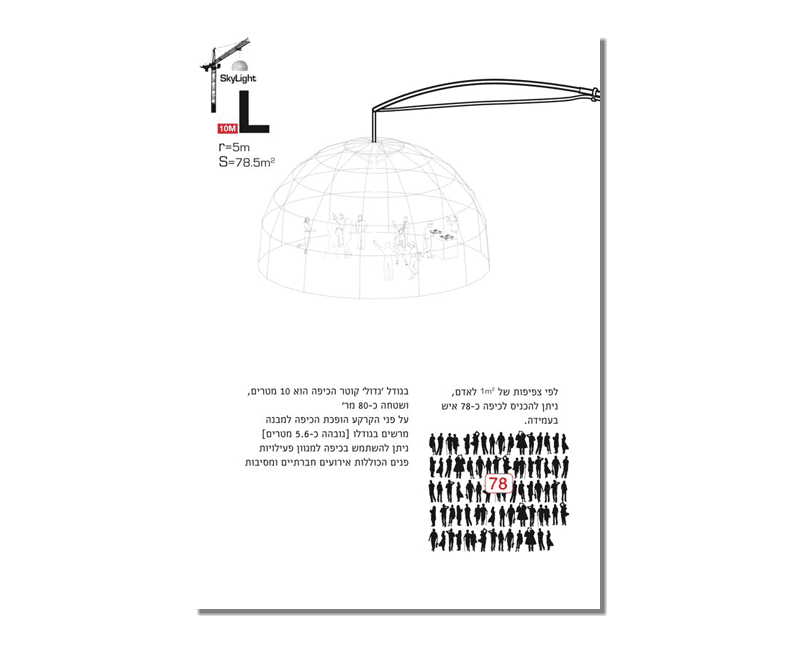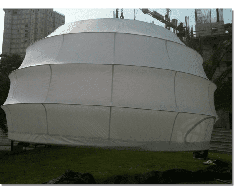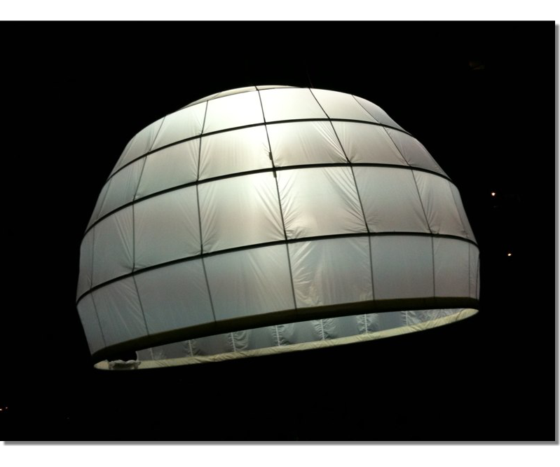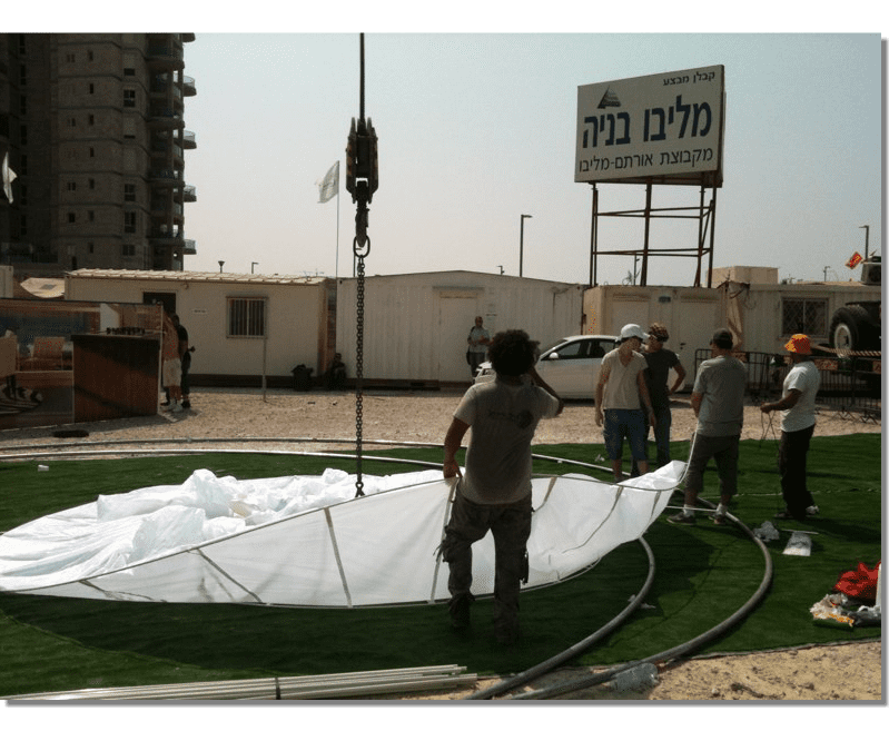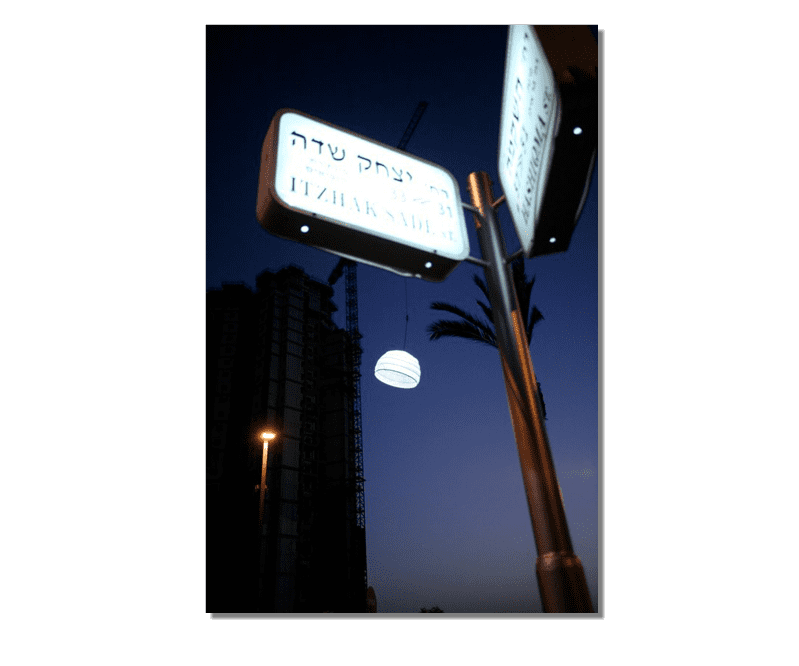 A project Created for 2010 Bat-Yam International Biennale of Landscape Urbanism. The concept is to illuminate the construction sites which are 'black holes' in the urban landscape. We hang Ikea 10m diameter Ikea Crinoline style paper light shades using the cranes which are idle during the night time. The Crinolines themselves are created using sailing canvas cut & stitched electronically to fit fiberglass reinforcement.
